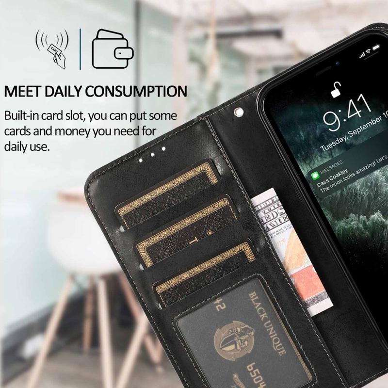 Deze hoes is gemaakt van retro mat polyurethaan met een zachte TPU-binnenlaag en biedt een comfortabel gevoel en betrouwbare bescherming tegen dagelijkse krassen, stoten en slijtage. De ingebouwde portemonnee heeft 3 kaartsleuven en een vak voor contant geld, zodat je al je benodigdheden gemakkelijk op één plek kunt meenemen. Het opvouwbare ontwerp doet ook dienst als standaard, waardoor je een comfortabelere handsfree kijkhoek hebt voor video's, surfen of bellen.