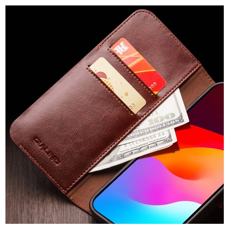 De Qialino Classic Wallet Leather Case voor iPhone 15 Pro Max is gemaakt van rundleer van topkwaliteit en geeft uw apparaat een stijlvolle en elegante uitstraling, terwijl het wordt beschermd tegen ongewenste dagelijkse schade. De portemonnee-etui heeft binnenvakken voor het opbergen van je geld en pasjes.