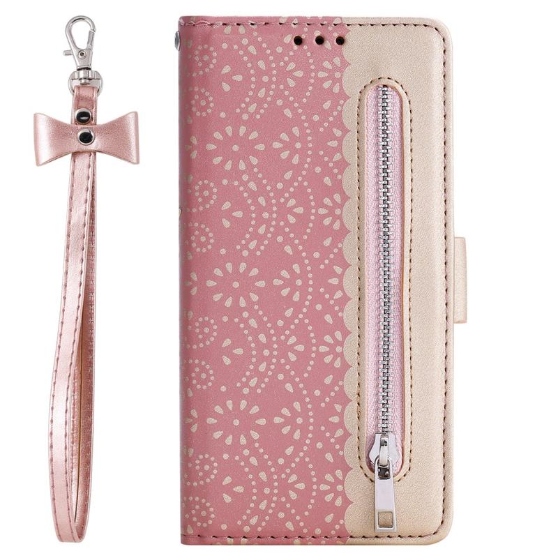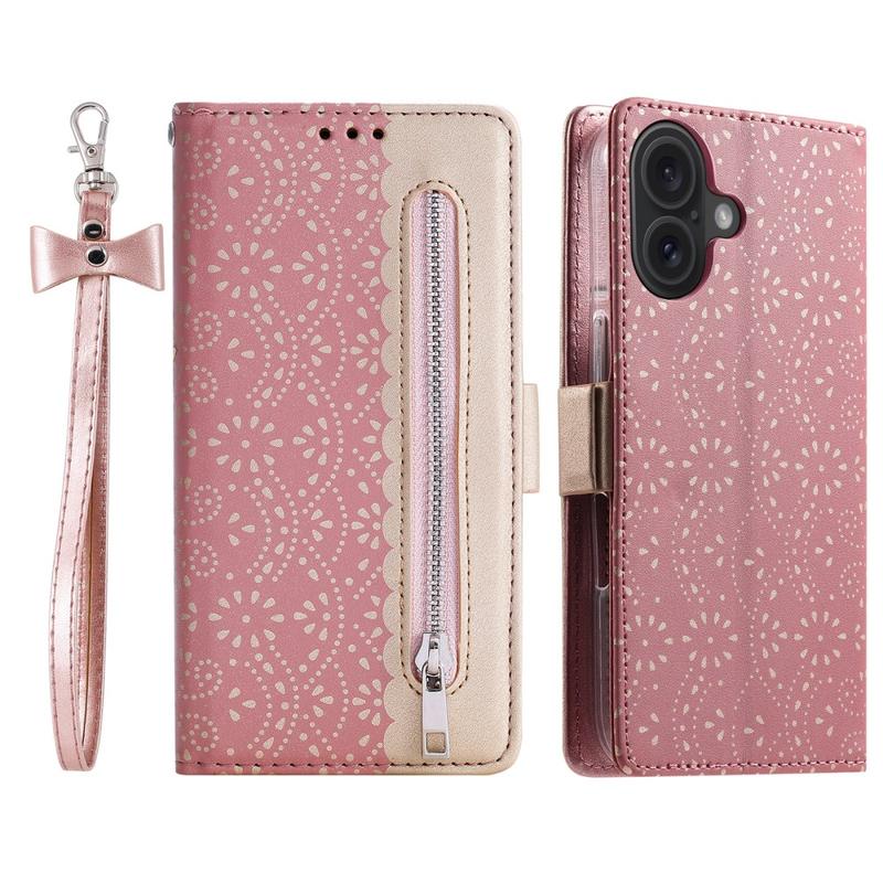 Dit enorm stijlvolle portemonnee hoesje met een kanten patroon beschermt jouw iPhone 16 Plus tegen schade en de rits aan de voorkant opent een compartiment voor briefgeld en kleingeld.
