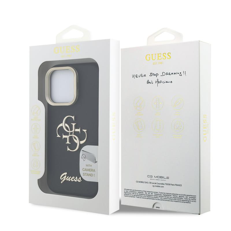 Guess 4G Logo Stand Camera Frame Hoesje voor iPhone 16 Pro Max - Designerstijl met handsfree gemak