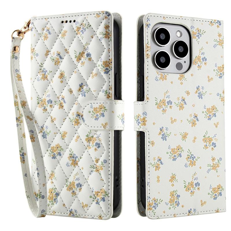 Ruitvormige Bloemen Portemonnee Hoesje voor iPhone 16 Pro - met riem en kaartsleuven