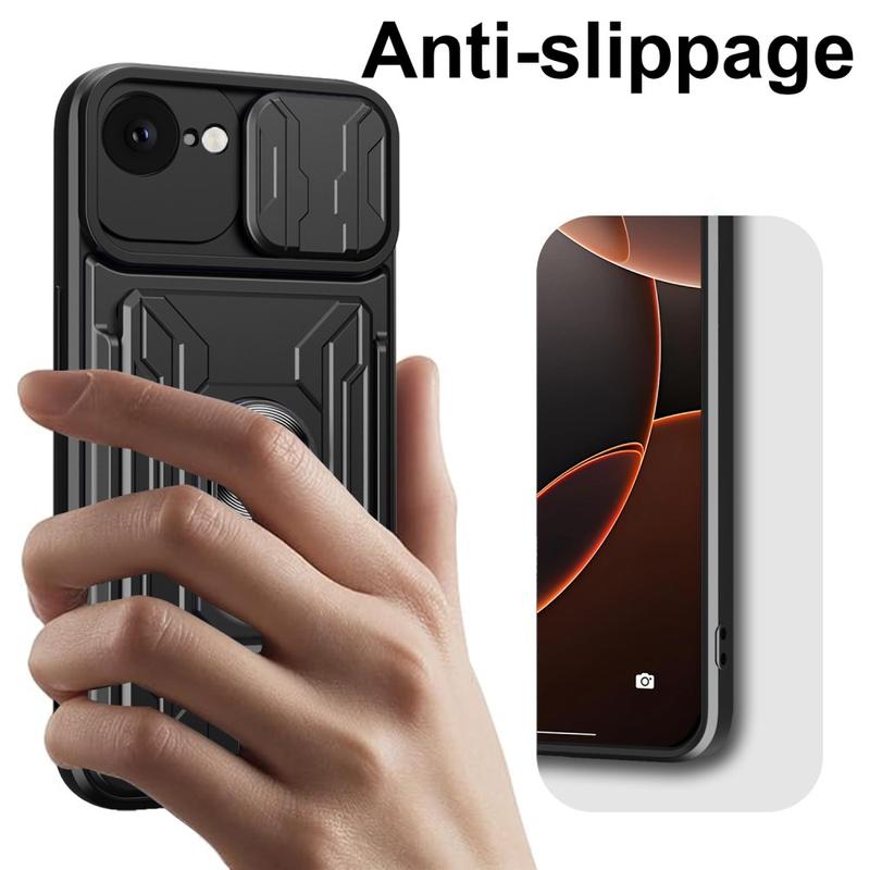 Gemaakt van premium plastic, TPU en metalen materialen, is deze case voor iPhone 16e gebouwd om de tand des tijds en bescherming te doorstaan. Met meerdere functies beschermt het perfect je iPhone 16e en maakt het ook comfortabel om te gebruiken en te kijken dankzij de roterende ring aan de achterkant.