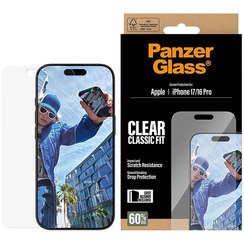 Bescherm je iPhone 17, iPhone 16 Pro met de PanzerGlass Classic Fit Screen Protector - gemaakt om krassen, schokken en verpletterende valpartijen te weerstaan. Gemaakt van 60% gerecycled glas, levert het dezelfde compromisloze sterkte terwijl het bijdraagt aan een duurzamere toekomst.