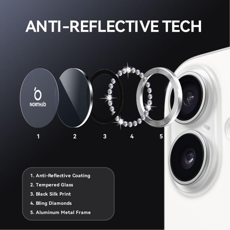 Voeg glans en bescherming toe aan je iPhone 17 met de NORTHJO Camera Lens Protector. Ontworpen met glinsterende steentjes en precisiegeslepen gehard glas, houdt het je cameralens veilig tegen krassen, stof en stoten terwijl het een vleugje elegantie en luxe toevoegt.