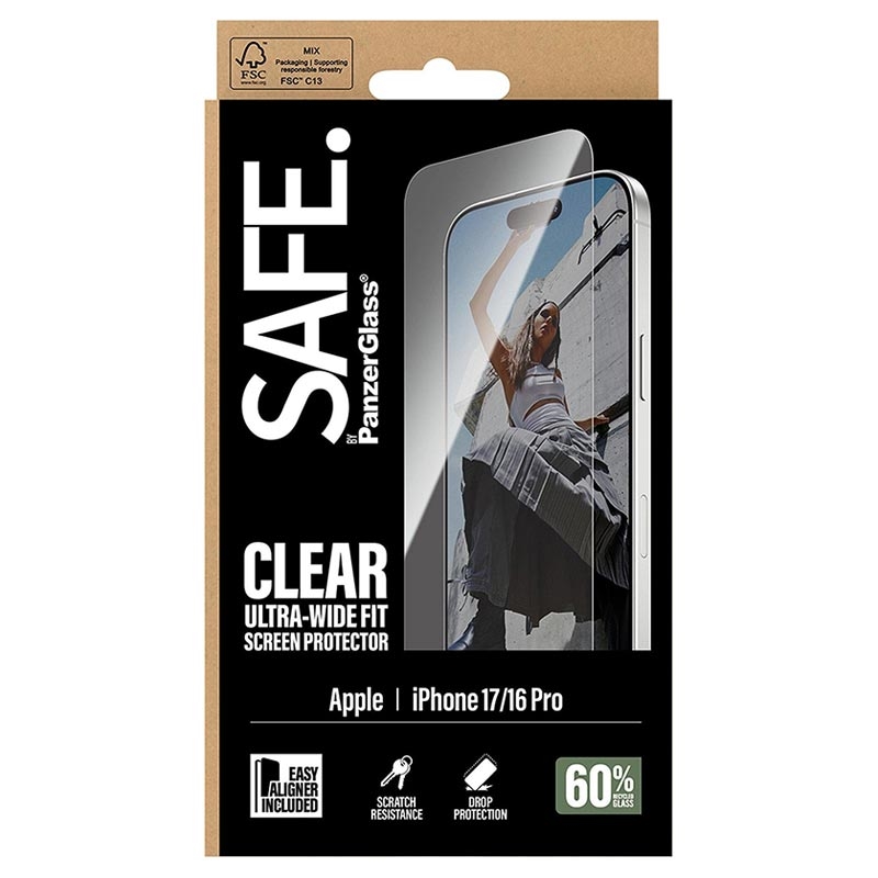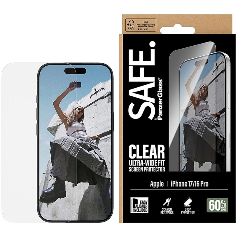 De SAFE. by PanzerGlass Screen Protector voor iPhone 17, iPhone 16 Pro biedt superieure bescherming met 60% gerecycled glas en beschermt je toestel tegen vallen, krassen en schokken. De ultrabrede pasvorm zorgt voor volledige dekking en duidelijk zicht op het scherm, terwijl de vingerafdrukbestendige coating je scherm schoon houdt. Met 100% aanraakgevoeligheid en eenvoudige installatie met behulp van de meegeleverde EasyAligner, combineert deze screen protector duurzaamheid en functionaliteit naadloos.