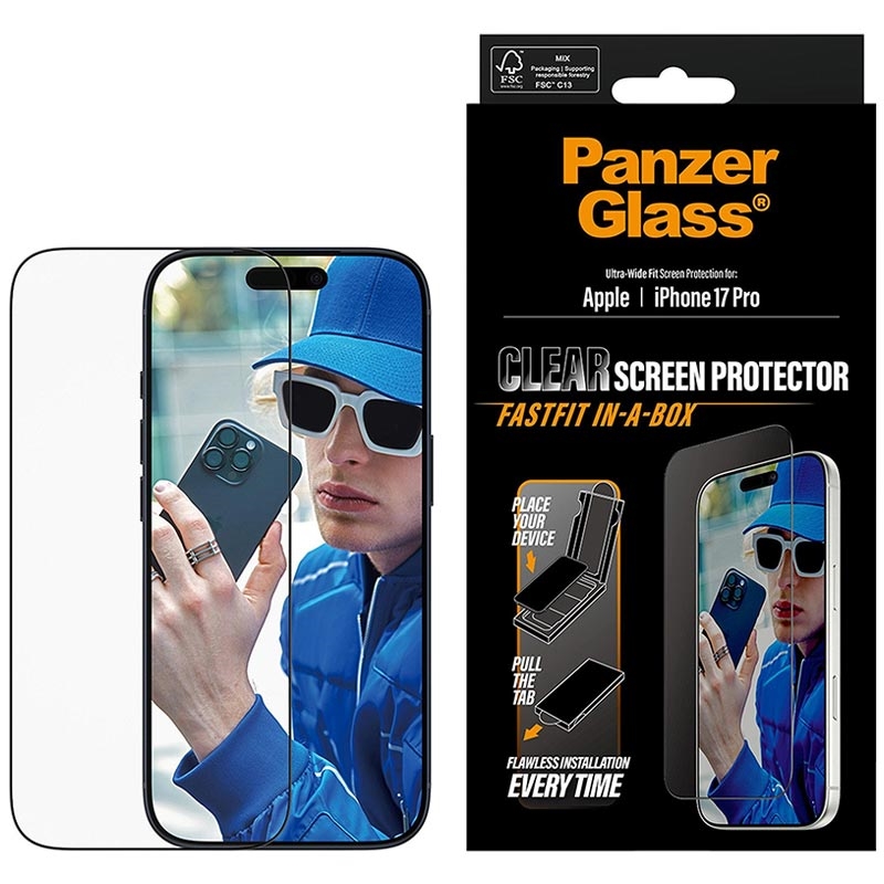 De PanzerGlass Ultra-Wide Fit Screen Protector voor iPhone 17 Pro is ontworpen voor snelle, bubble-free installatie dankzij het innovatieve FASTFIT IN-A-BOX systeem. Plaats je iPhone 17 Pro gewoon met de voorkant naar boven, trek aan het lipje en geniet elke keer van een perfect uitgelijnde protector - geen stof, geen frustratie.