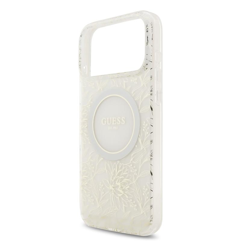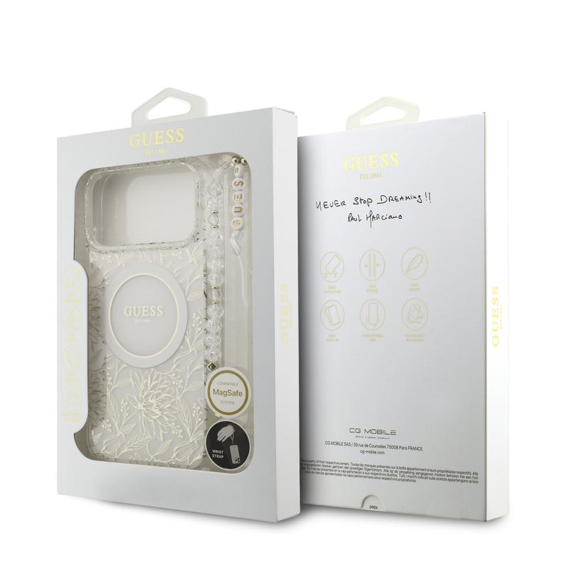 iPhone 17 Pro Max Guess IML Bloemen Allover Electro Hoesje met Parelband - MagSafe Compatibel - Wit