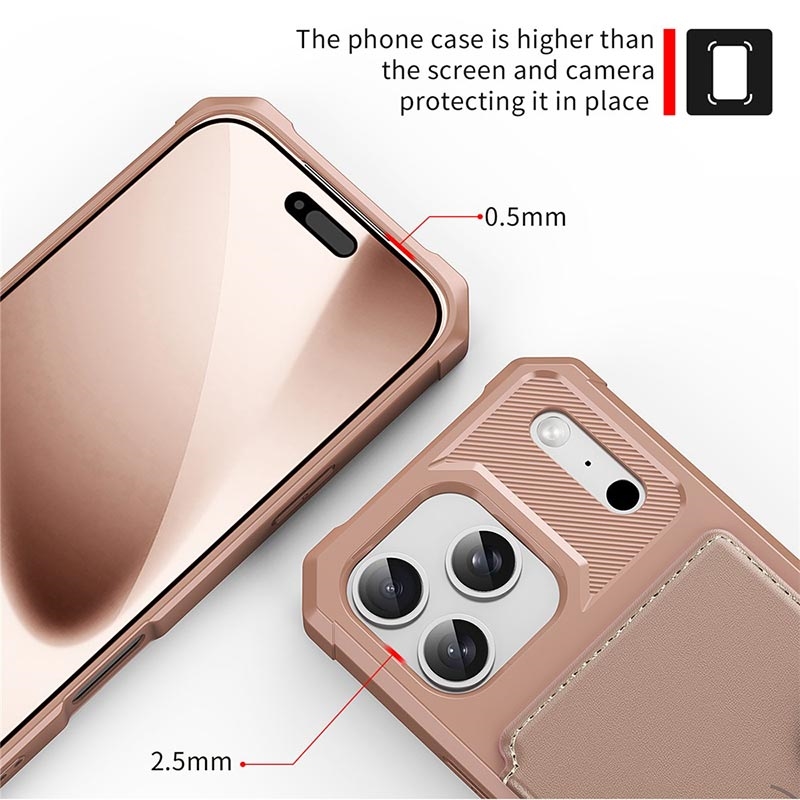 - De iPhone 17 Pro portemonneehoes heeft een veilige drukknoopsluiting, een portemonneeontwerp en diverse kaartvakken met een vakje voor contant geld.