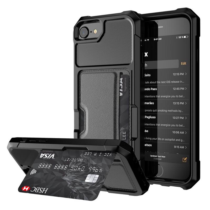 Plaats je creditcard in het achtervak van de case en gebruik hem als standaard, dankzij de slim ontworpen sleuf. Maak je geen zorgen over stoten en krassen, want een TPU-cover met versterkte randen absorbeert ze. Ingebouwde metalen plaat maakt het gebruik van deze hybride kaartsleuf met magnetische houders mogelijk. Opstaande randen rond de camera en het scherm van je iPhone 7, iPhone 8, iPhone SE (2020), iPhone SE (2022) zorgen voor extra bescherming.