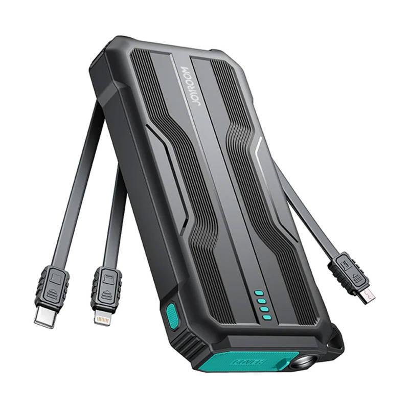 De Joyroom powerbank met een capaciteit van 10.000mAh is ontworpen om onder alle omstandigheden stroom te leveren. Uitgerust met 3 kabels is hij perfect voor het voeden van smartphones en tablets. Bijkomend voordeel is het ingebouwde SOS-alarm. Daarnaast onderscheidt het product zich door zijn bestendigheid tegen vallen, water en stof, en de slimme chip garandeert volledige bescherming van de apparatuur tijdens het opladen. Het apparaat is ook handig als zaklamp en heeft 2 lichtstanden. Bovendien voldoet het aan internationale luchtvaartnormen en is het gemakkelijk mee te nemen dankzij de karabijnhaak.