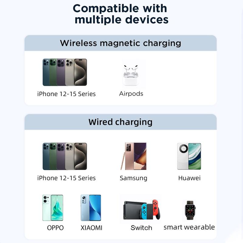 Wordt geleverd met een afneembare kabel, kan drie apparaten opladen met één kabel, inclusief voor Apple/Android apparaten/zelf opladen