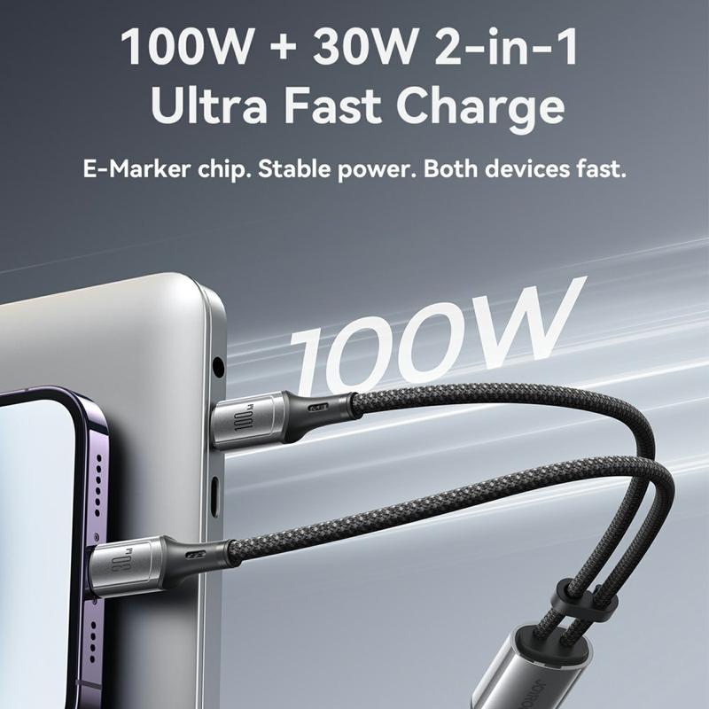 • Joyroom S-A57 100W 2-in-1 oplaadkabel - USB-C naar USB-C + Lightning dubbele connector, 480 Mbps gegevenssynchronisatie, nylon gevlochten