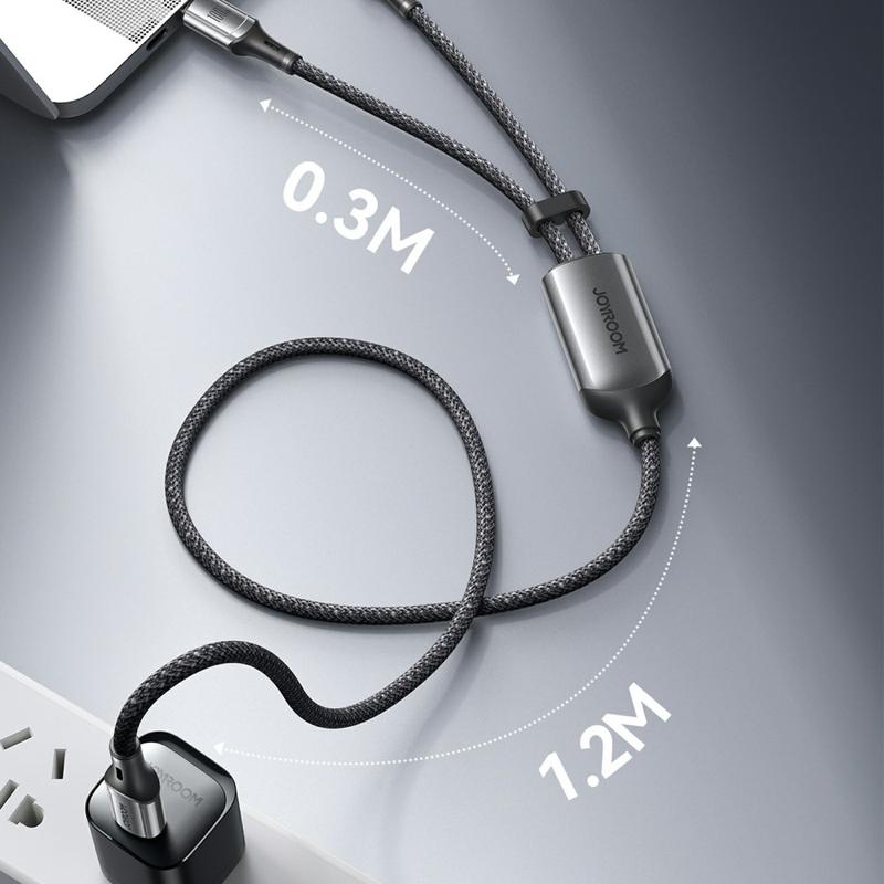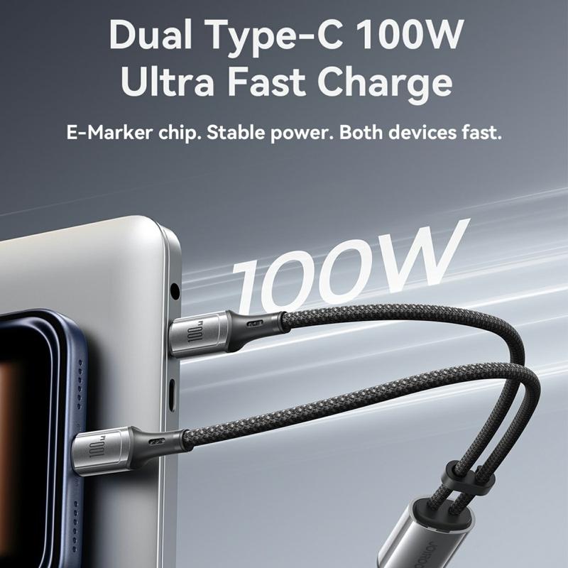 Joyroom S-A57 USB-C naar dubbele USB-C kabel - 100W snel opladen met e-marker, 480 Mbps datasynchronisatie, gevlochten nylon, kabelbinder inbegrepen