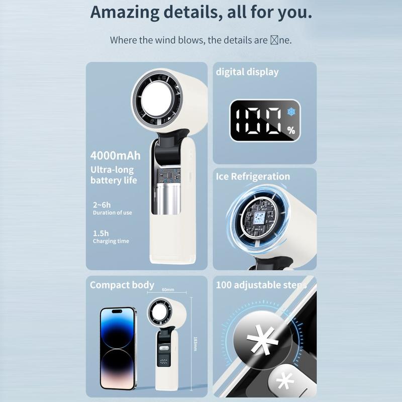 K-801 Handheld koudedrukventilator - draagbare koeler met 100 snelheden, digitale batterijweergave en halfgeleider-ijstechnologie, oplaadbaar via USB-C