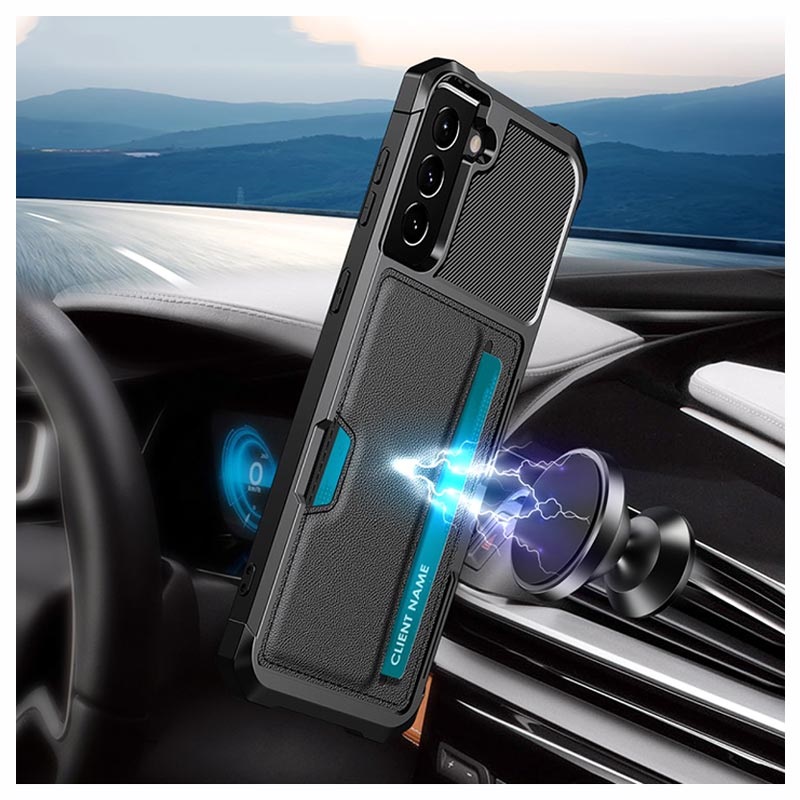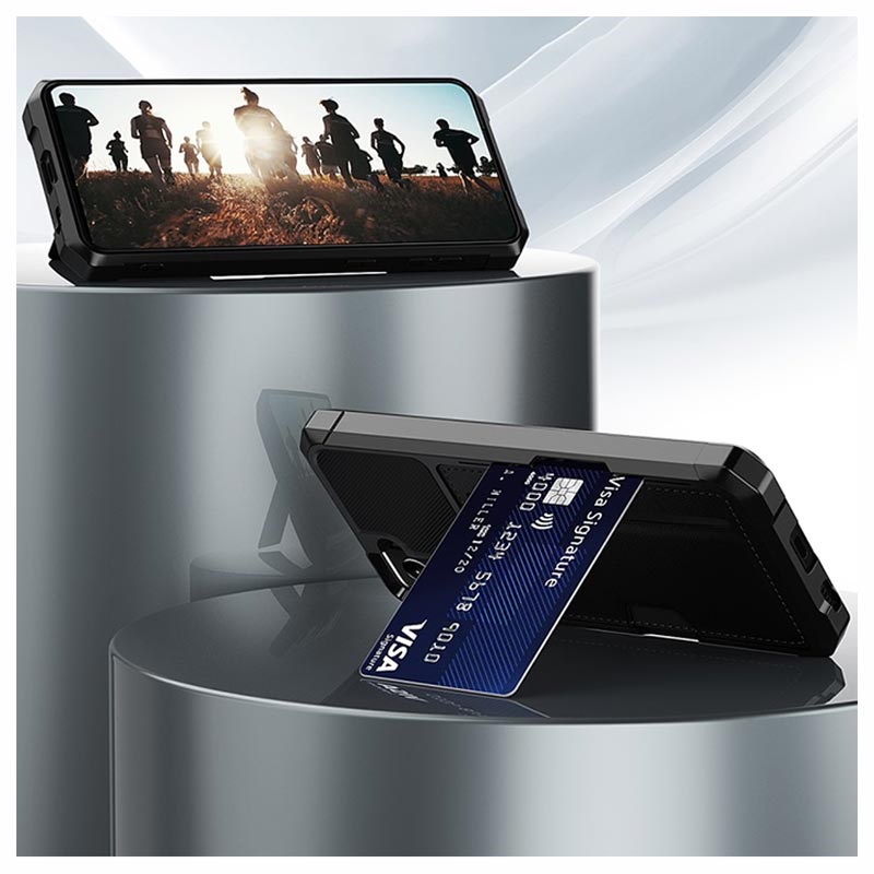 Plaats je creditcard in het achtervak van de case en gebruik hem als standaard, dankzij de slim ontworpen sleuf. Maak je geen zorgen over stoten en krassen, want een TPU-cover met versterkte randen absorbeert ze. Ingebouwde metalen plaat maakt het gebruik van deze hybride kaartsleuf met magnetische houders mogelijk. Opstaande randen rond de camera en het scherm van je Samsung Galaxy S21 5G zorgen voor extra bescherming.