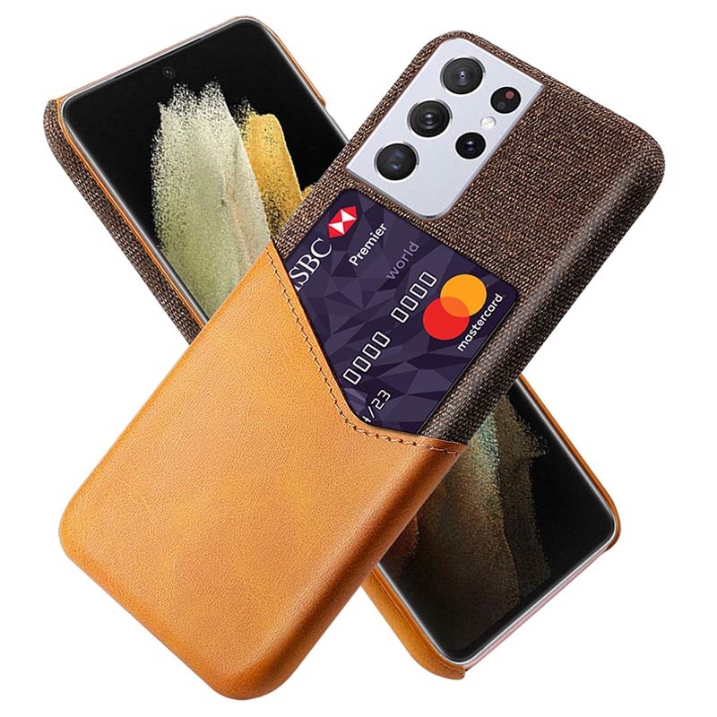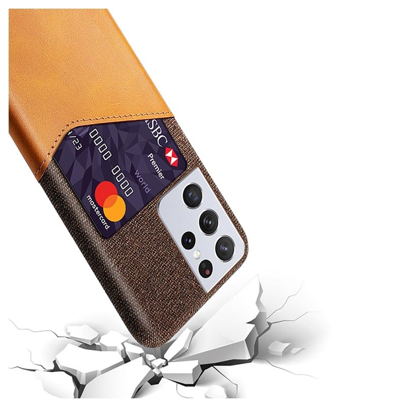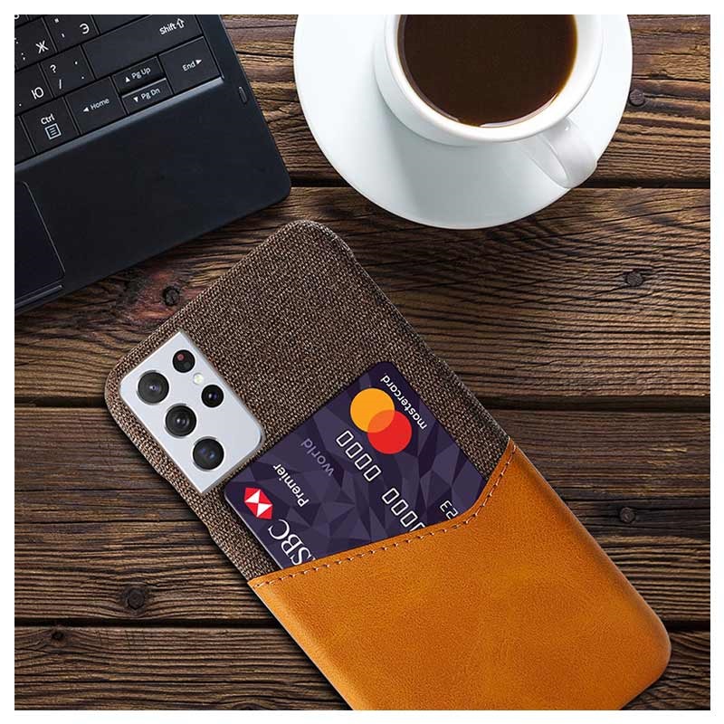 De duurzame polycarbonaat kap is gecoat met een modieuze doek die het slanke en elegante ontwerp aanvult. Een zachte polyurethaanlaag vormt een discreet kaartvak, waardoor deze hoes praktischer is. Deze duurzame, schokbestendige hoes is gemaakt om als gegoten om uw Samsung Galaxy S21 Ultra 5G te passen, terwijl de functionaliteit intact blijft.