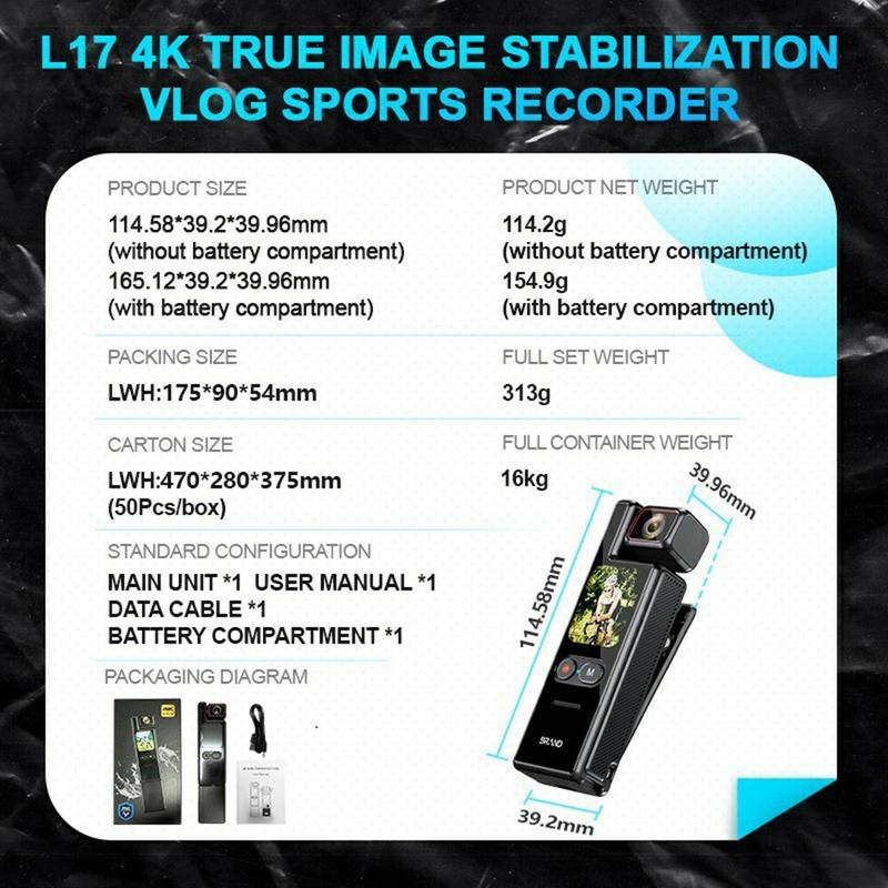 Om beelden stabiel te houden, maakt de L17 gebruik van een 6-assig gyroscoopstabilisatiesysteem met 3 instelbare niveaus, waardoor trillingen tijdens bewegingen worden verminderd. Een 1.69-inch TFT-touchscreen maakt bediening en previews eenvoudig, en dankzij de ingebouwde wifi kun je bestanden overzetten en de camera bedienen via een smartphone-app. De opslag is ook flexibel, met ondersteuning voor snelle U3-kaarten tot 512 GB. Dankzij de meegeleverde kaart van 64GB en kaartlezer kun je meteen beginnen met opnemen. Een magnetische clip en 1/4"-schroefbevestiging bieden extra bevestigingsmogelijkheden voor trainingen, fietsen of reizen.