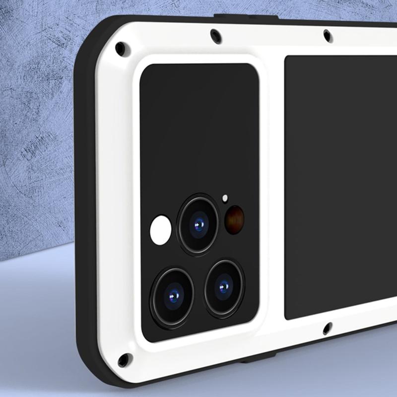 LIEFDE MEI Voor iPhone 14 Pro Siliconen + Metalen Schokbestendige Case Spatwaterdichte Telefoon Cover met Gehard Glas Screen Protector
