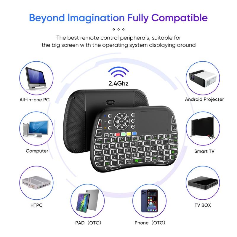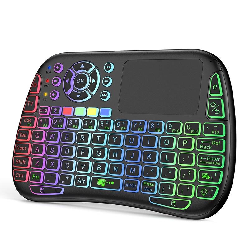 Het toetsenbord ondersteunt zowel een 2,4 GHz draadloze verbinding via een USB-ontvanger als Bluetooth 5.0, waardoor u flexibel bent met veel apparaten, waaronder smart-tv's, HTPC-systemen, laptops, tablets en Android-apparaten. Het ingebouwde touchpad met multi-touchgebaren vervangt een muis, terwijl de kleurrijke RGB-achtergrondverlichting het gebruik zelfs in donkere kamers gemakkelijk maakt.