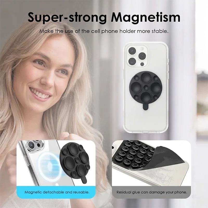 Houd je telefoon veilig en binnen handbereik met deze handsfree magnetische telefoonhouder met zuignap. Deze compacte houder is ontworpen voor dagelijks gebruiksgemak en combineert een sterke magnetische bevestiging met een siliconen zuignap, waardoor je je telefoon eenvoudig op gladde oppervlakken zoals spiegels, tegels, glas en muren kunt plaatsen.
