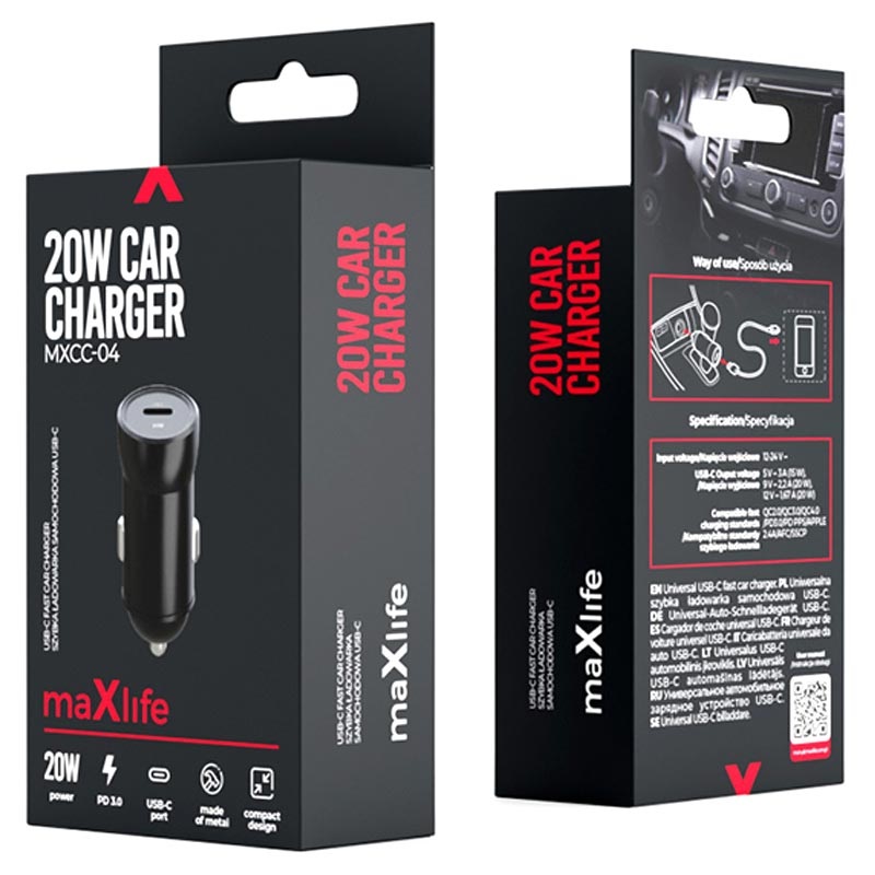 Maxlife MXCC-04 USB-C Snelle Autolader - 20W, PD3.0, QC3.0, Apple 2.4A, Samsung AFC