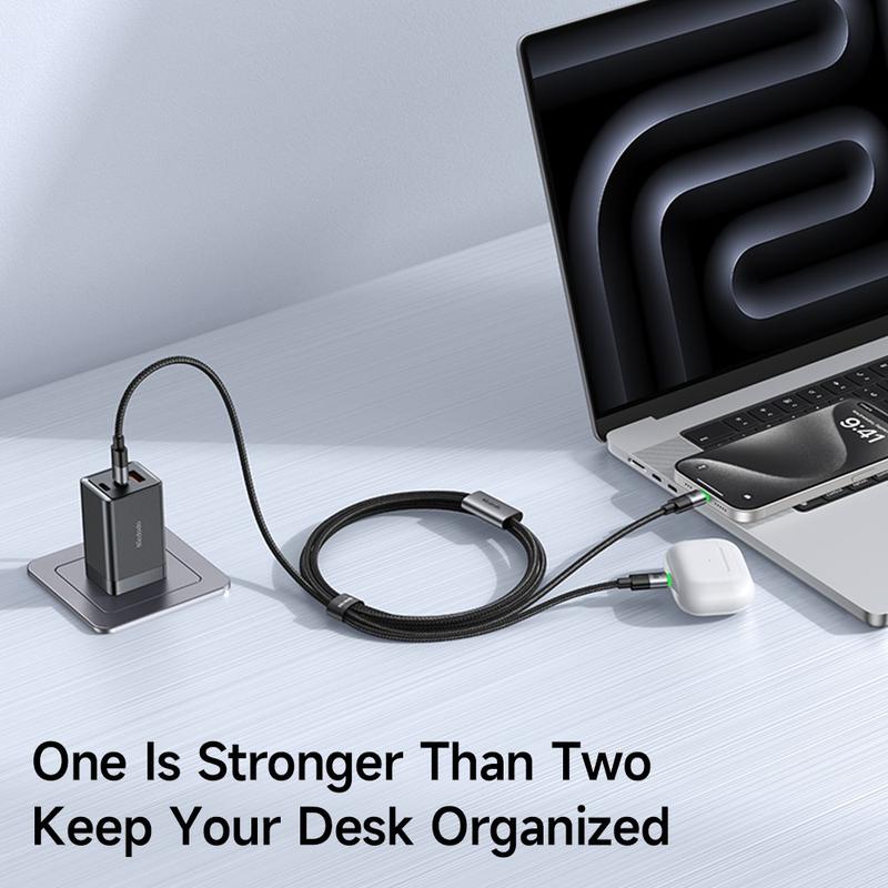 Als je bureau, rugzak of koffer vol ligt met kabels, is deze 2-in-1 gevlochten kabel de resetknop die je nodig hebt. Twee USB-C stekkers komen uit één stevig omhulsel, zodat je een laptop snel kunt opladen of stroom kunt splitsen tussen twee kleinere apparaten zonder adapters te hoeven verwisselen.