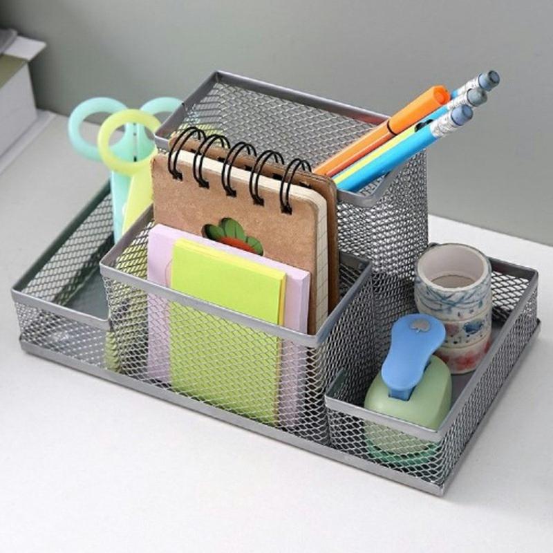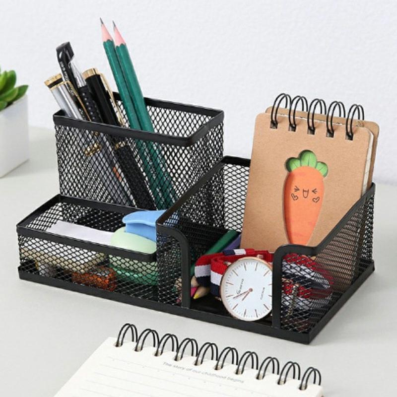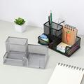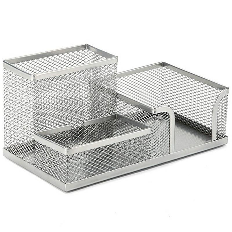 Ruim in een paar seconden rommel op met deze gestroomlijnde opbergdoos van metaalgaas. Drie aparte secties houden pennen, paperclips, scharen en plakbriefjes perfect op orde, terwijl het luchtige gaasontwerp een eigentijds tintje geeft aan elk bureau, elke plank of toilettafel.
