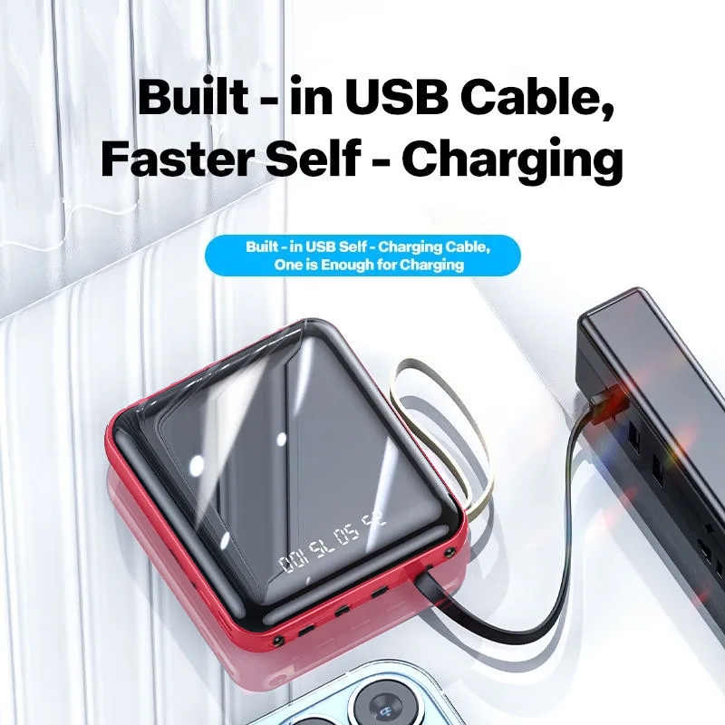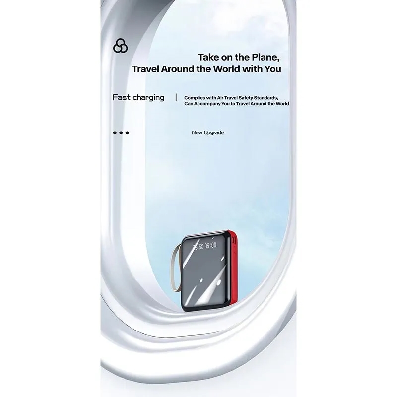 Laad elk apparaat op met deze mini powerbank! Ontworpen met geïntegreerde Lightning-, Type-C- en micro-USB-kabels en twee USB-uitgangen - universele compatibiliteit.