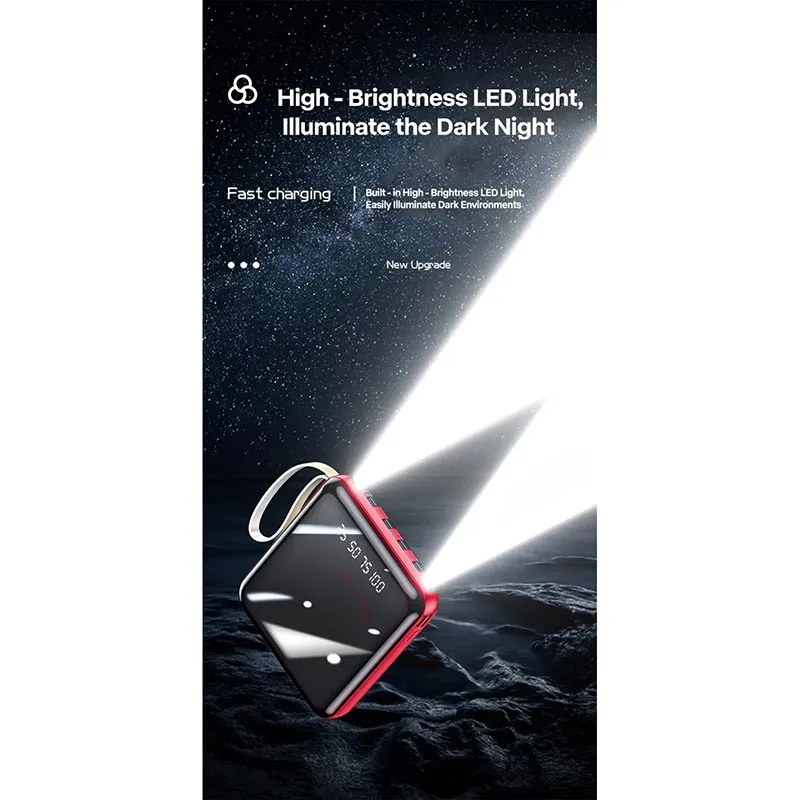 Deze powerbank in zakformaat heeft ook drie ingangen, microUSB- en USB-C-poorten en een ingebouwde USB-kabel. Hij is perfect voor op de camping, dankzij de capaciteit van 20000mAh en twee zaklampen. Een spiegelachtig oppervlak met digitale LED-nummers voor het aangeven van het resterende vermogen.