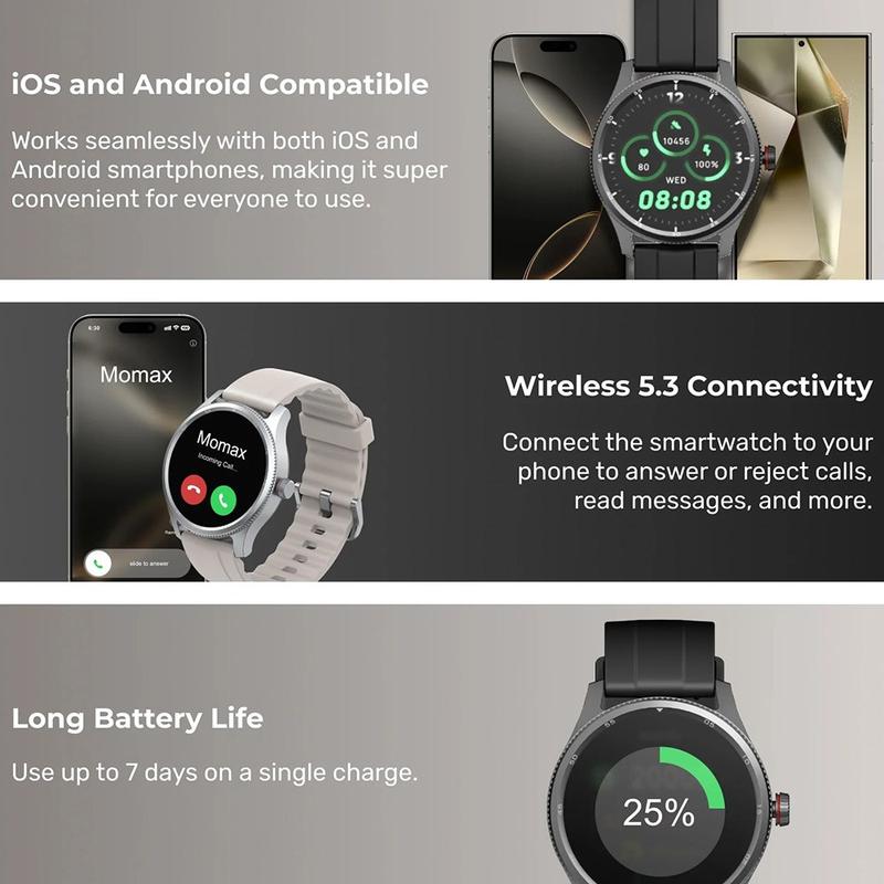 Houd uw dag bij met de MOMAX 1-Wear Smart Watch, een sportieve, stijlvolle smartwatch die is gemaakt voor het bijhouden van uw dagelijkse gezondheid en actieve routines. Het apparaat meet uw hartslag, SpO2 (bloedzuurstof) en stress, biedt AI-aangedreven slaapanalyse (inclusief diepe slaap en REM) en houdt uw trainingen bij met meer dan 100 sportmodi. Het ronde TFT-touchscreen van 1,38 inch is helder, gemakkelijk te bedienen en aanpasbaar met meerdere wijzerplaten, zodat het er op het werk net zo goed uitziet als tijdens de training. Met IP68-waterbestendigheid, Wireless 5.3-connectiviteit en een batterijduur tot 7 dagen is het ontworpen voor gemak van 's ochtends tot 's avonds.