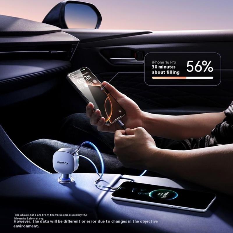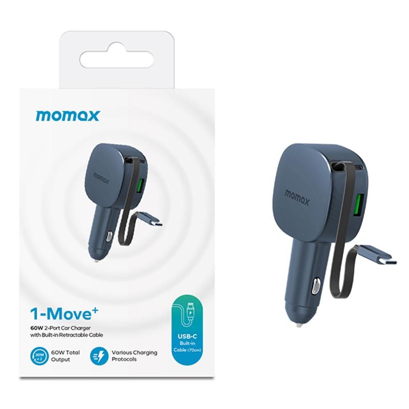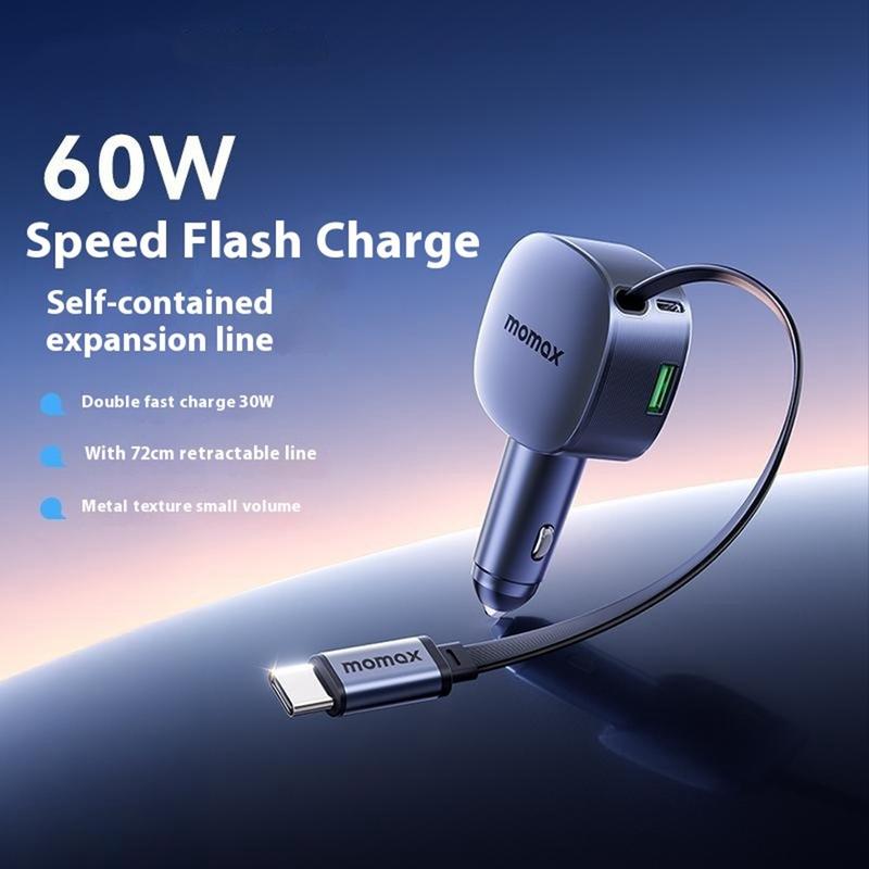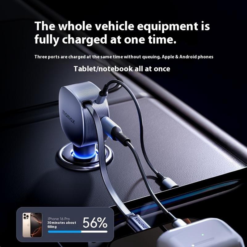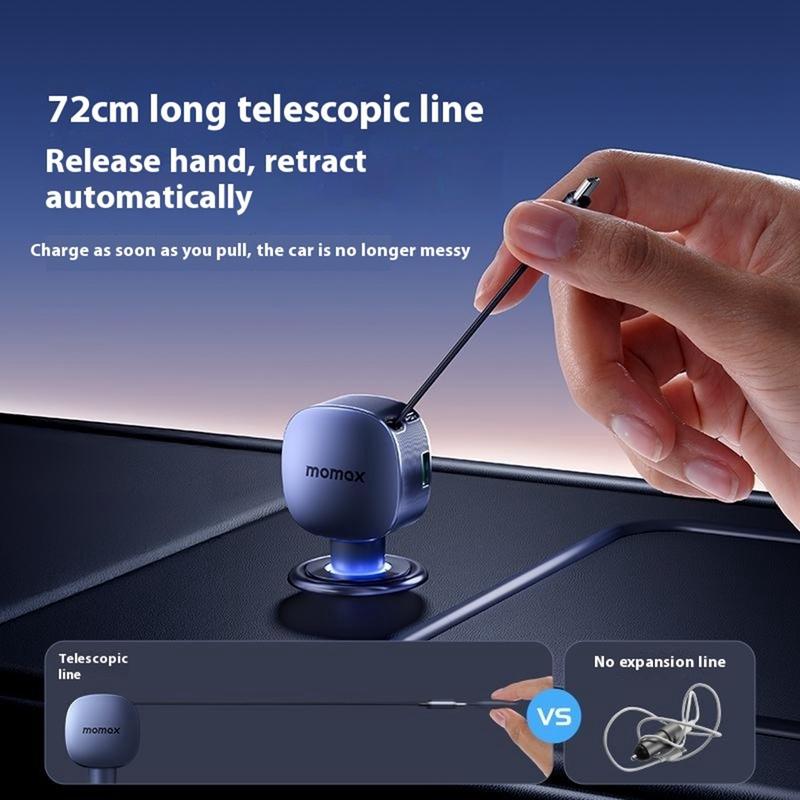 Momax 60W Autolader - Intrekbare 30 W USB-C Kabel + 30 W USB-C Poort + 24 W USB-A Snellaadadapter