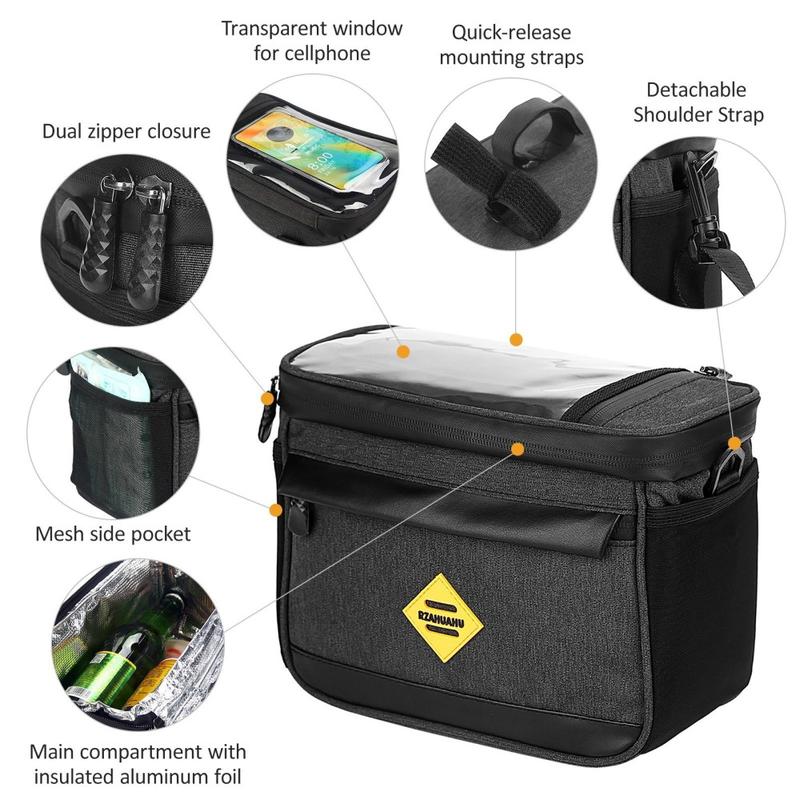 Deze stuurtas is gemaakt van waterafstotend oxford doek voor langdurig gebruik. Het hoofdvak met ritssluiting is ruim en geïsoleerd, wat betekent dat je er veel spullen in kwijt kunt en je drank koel kunt houden. Het doorzichtige zakje aan de bovenkant biedt een handig "display platform" voor je kaart of mobiele telefoon. In de gaasvakken aan beide zijkanten kun je in een paar seconden wat kleine spullen binnen handbereik houden. In het voorvak met rits kun je waardevolle spullen veilig opbergen. Met een zelfklevende bevestigingsband kun je de tas gemakkelijk aan je fietsstuur bevestigen. En met de afneembare, verstelbare schouderriem kun je de tas gemakkelijk dragen als je hem van de fiets haalt.