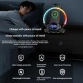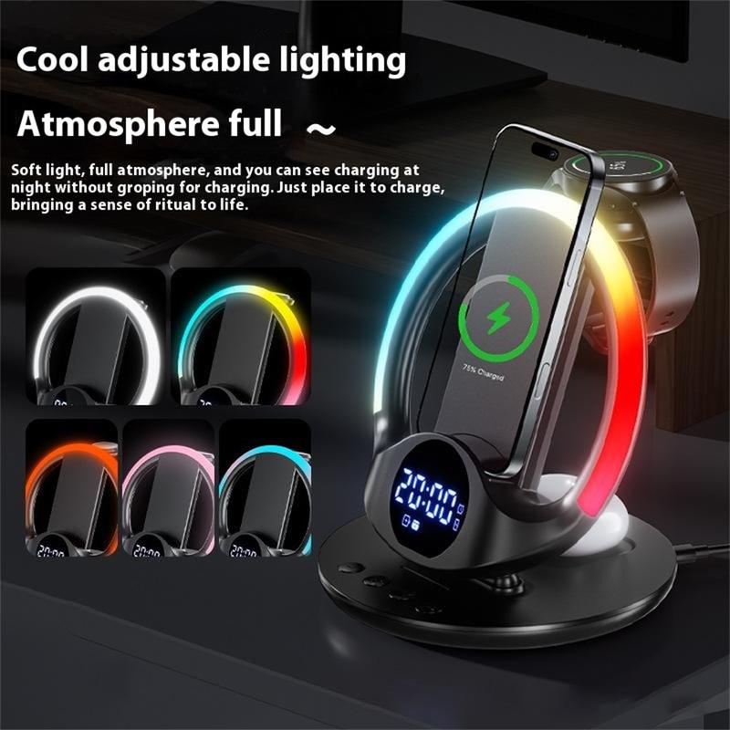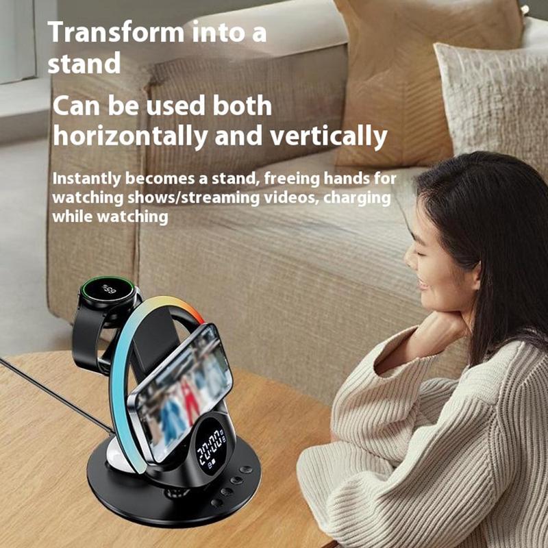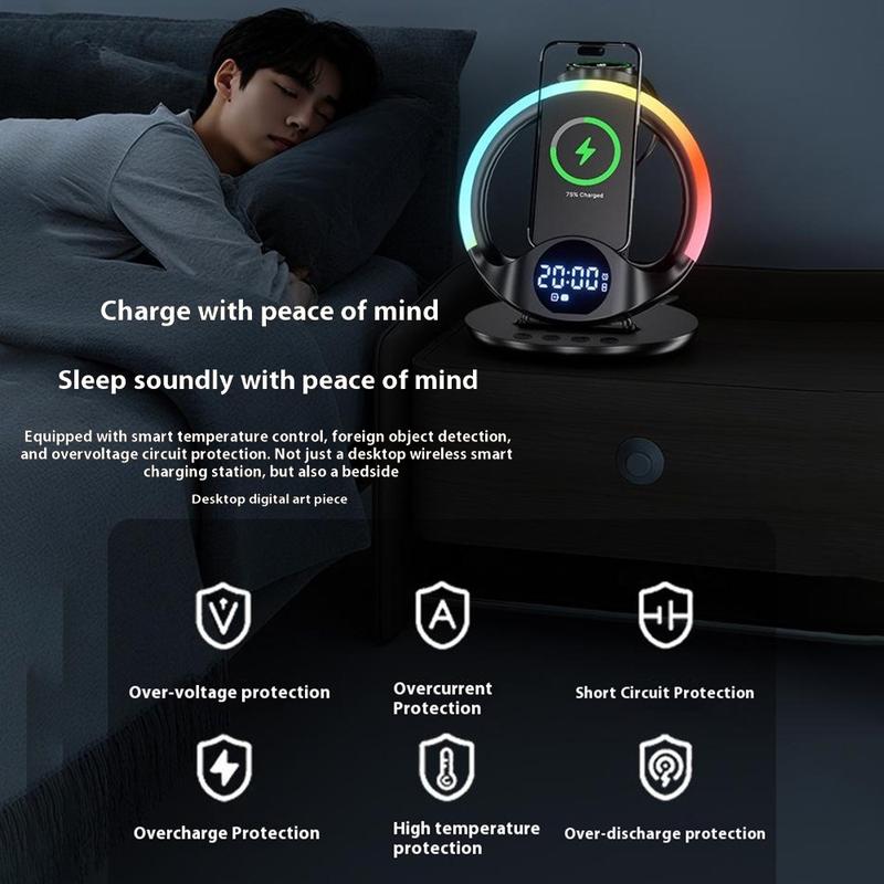 Meer dan alleen een oplader - het werkt ook als een digitale klok en telefoonstandaard. Kies uit vijf omgevings-LED-achtergrondverlichtingsstanden (wit, roze wit, rood, ijsblauw, fantasiekleur) om bij je stemming of decor te passen.