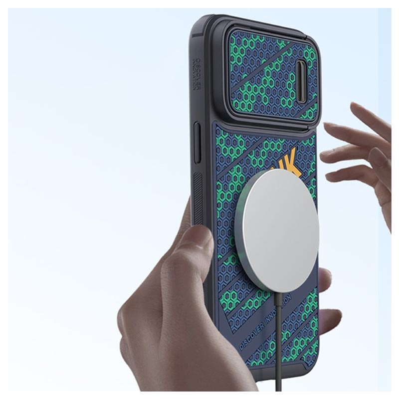 Deze dubbellaagse hoes met een uniek 3D-honingraatontwerp is gemaakt van flexibel, schokabsorberend TPU-materiaal en hard plastic, met een ingebouwd magnetisch vel dat compatibel is met Apple MagSafe-accessoires. Daarnaast is de case voorzien van een cameraschuifregelaar die de camera op je iPhone 14 Pro volledig beschermt.