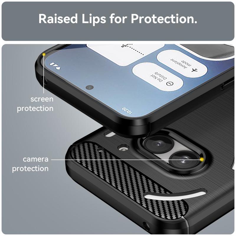Het hoesje van geborsteld TPU beschermt je Nothing Phone (2a), (2a) Plus voldoende en geeft het een geweldige stijl, dankzij het koolstofvezelpatroon op de achterkant. De case zorgt ook voor oververhitting bij gebruik van je Nothing Phone (2a), (2a) Plus, met zijn ontwerp voor warmteafvoer.