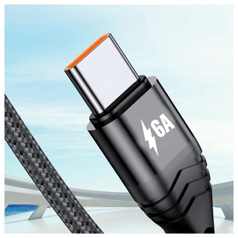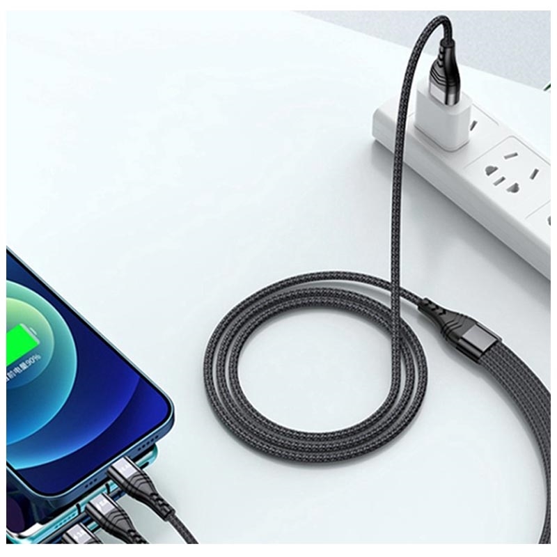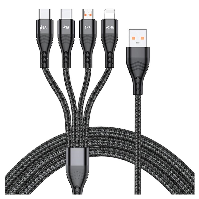 Deze nylon gevlochten universele 4-in-1 kabel heeft een Lightning, een microUSB en twee Type-C connectoren aan één uiteinde. Met een maximaal uitgangsvermogen van 66W en met ondersteuning voor snelladen. Op elke connector staat het maximale uitgangsvermogen aangegeven, 6A USB-C, 3A USB-C, 2.4A Lightning en 2A microUSB.