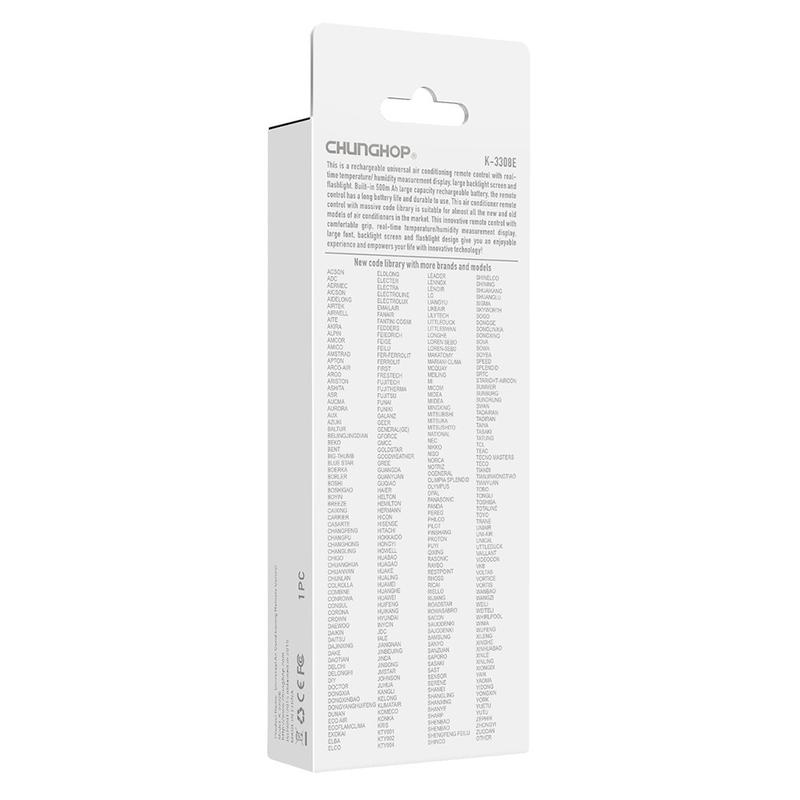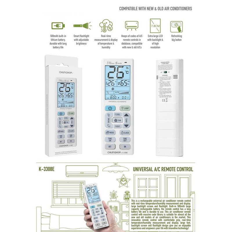 Investeren in de CHUNGHOP K-3308E voorkomt het ongemak van jongleren met meerdere AC-afstandsbedieningen of zoeken naar specifieke merkvervangers. De oplaadbare batterij bespaart geld en vermindert verspilling, terwijl het real-time temperatuur- en vochtigheidsdisplay je in staat stelt om de omstandigheden precies goed te houden. Compact en rijk aan functies, het is een praktische, kosteneffectieve oplossing voor het handhaven van een comfortabele woon- of werkruimte.