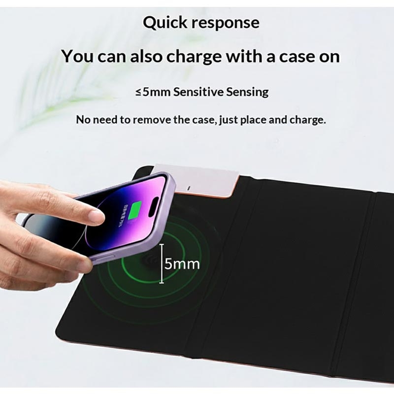De ingebouwde draadloze oplaadmodule ondersteunt tot 15W snel opladen, waardoor compatibele smartphones snel en efficiënt van stroom worden voorzien. Met ultradunne sensortechnologie (≤5 mm) laadt hij betrouwbaar op, zelfs door de meeste telefoonhoesjes heen.