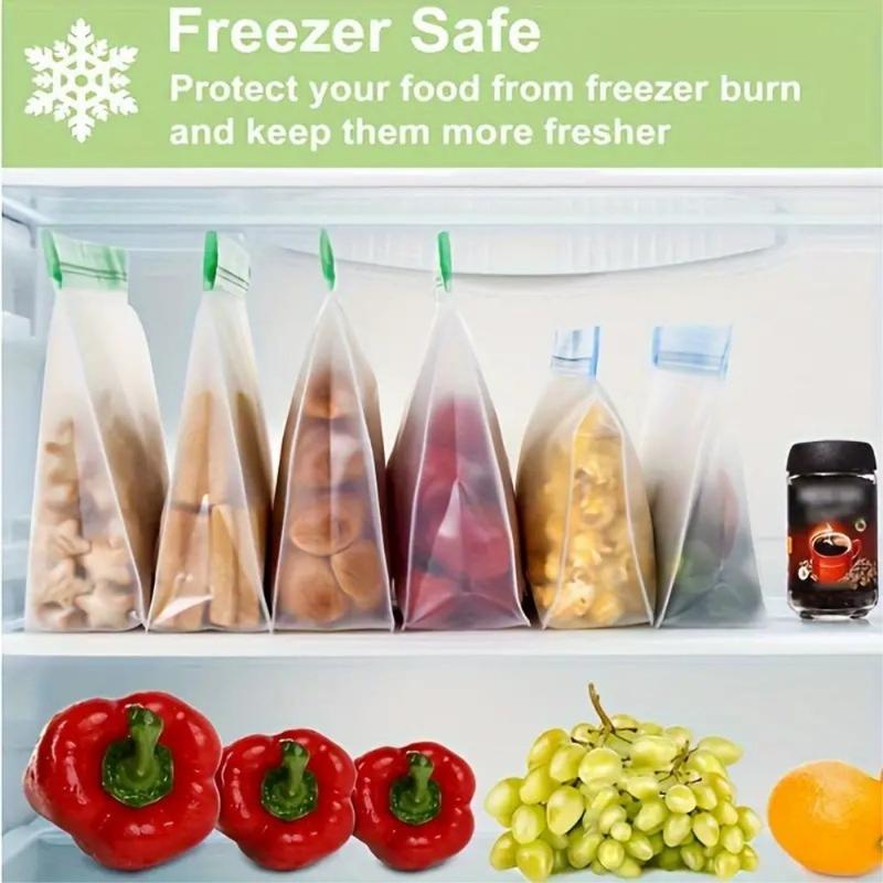 Houd je eten vers en georganiseerd met deze set van 10 herbruikbare PEVA-opbergzakjes, verkrijgbaar in de maten S/M/L. Deze BPA-vrije, FDA-gecertificeerde zakjes zijn perfect voor het bewaren van voedsel in de koelkast, ze garanderen veiligheid en versheid en zijn tegelijkertijd milieuvriendelijk.