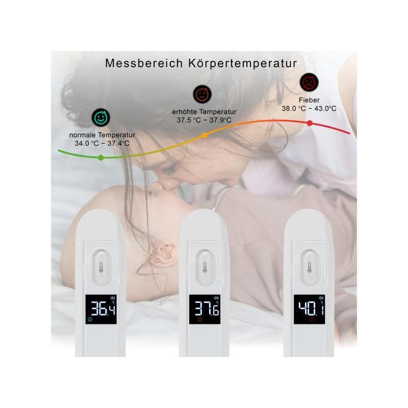 Deze voorhoofdthermometer is onmisbaar voor ouders en verzorgers die op zoek zijn naar een betrouwbare, hygiënische manier om de lichaamstemperatuur te controleren. Met zijn contactloze werking, snelle resultaten en gebruiksvriendelijk ontwerp biedt hij gemoedsrust, of je nu thuis bent of onderweg. De 3-kleuren koortsindicator en stille modus maken hem bijzonder handig om 's nachts te controleren zonder de slaap te verstoren.