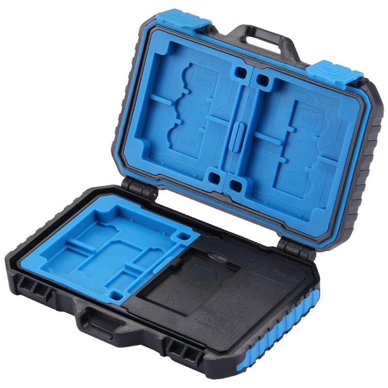 Een kaartlezer en opbergcase in één - met deze Puluz PU5004 kunt u maximaal 22 verschillende SIM- en geheugenkaarten meenemen en deze verbinden met uw OTG-compatibele smartphone, tablet, pc of laptop. Dankzij het lichte en compacte ontwerp kun u hem bij u dragen en hebt u al uw kaarten en de lezer binnen handbereik. Een stevige, slijtvaste en waterbestendige kunststof case beschermt uw kaarten tegen beschadiging. Het wordt geleverd met een microUSB 3.0 naar USB 3.0 kabel met microUSB- en Type C-aansluitingen.