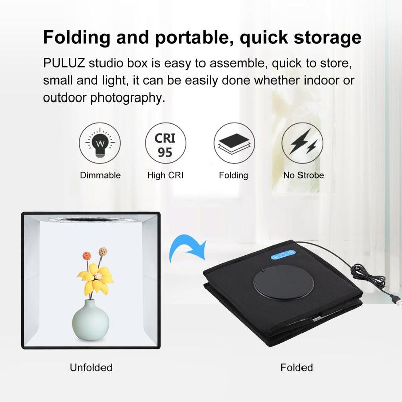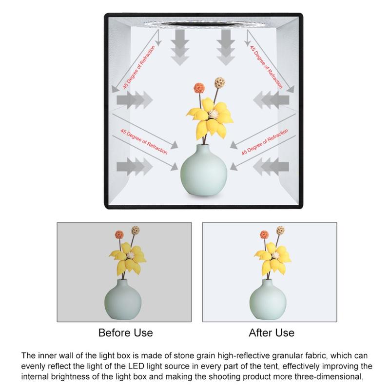 Draagbaar vouwontwerp, gemakkelijker te installeren en mee te nemen, ingebouwd LED-licht, zorgt voor gemiddeld licht, voorkomt schaduw en reflectie op de foto