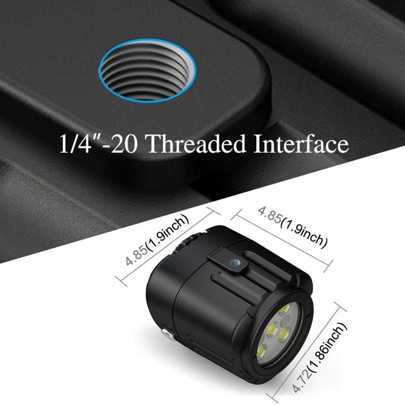 De lamp is gemaakt van een duurzame aluminium behuizing en is waterdicht tot 40meter (geen extra behuizing nodig), waardoor hij klaar is voor echt gebruik onder water, terwijl hij toch klein genoeg is om op helmen, fietsbevestigingen, handgrepen, drones of camerakooi te monteren. Met meerdere helderheidsmodi plus SOS kunt u zich snel aanpassen aan verschillende scènes en omstandigheden.