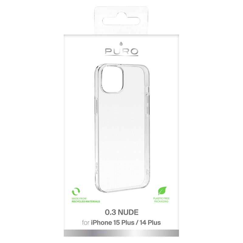 De 0.3 Nude cover van Puro beschermt de delicate afwerking van je iPhone 15 Plus.