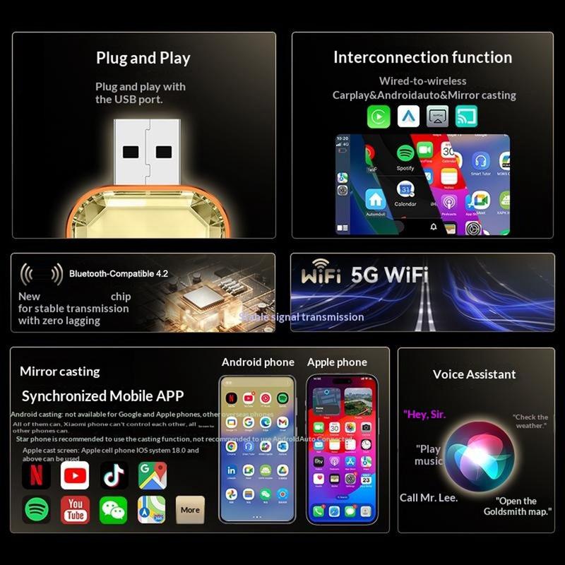 Met Bluetooth 4.2 en dual-band wifi biedt hij een stabiele verbinding met lage latentie voor navigatie, telefoongesprekken, muziek en het afspelen van bepaalde video's. De compacte behuizing van geanodiseerd aluminium met diamantgeslepen afwerking geeft hem een premium uitstraling, terwijl de plug-and-play-installatie ervoor zorgt dat je hem direct kunt gebruiken.