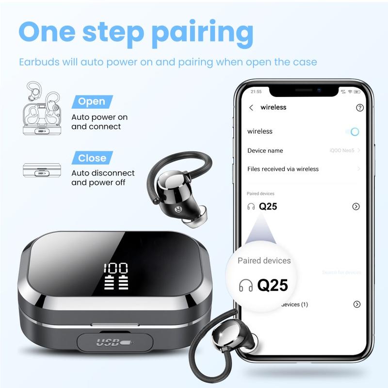 De Q25 draadloze oortjes zijn gemaakt voor gebruikers die op zoek zijn naar een stevige pasvorm, praktische batterijondersteuning en flexibel luisterplezier voor dagelijks gebruik, allemaal in één compact geheel. Dankzij het ergonomische oorhaakontwerp blijven ze comfortabel op hun plaats zitten tijdens het sporten, woon-werkverkeer, wandelen en dagelijks gebruik, terwijl de meegeleverde oplaadcase extra gemak biedt met een ingebouwde powerbankfunctie. Dit maakt de Q25 een slimme keuze voor mensen die meer willen dan een standaard paar draadloze oortjes.