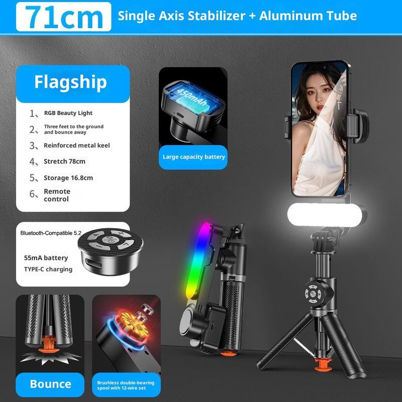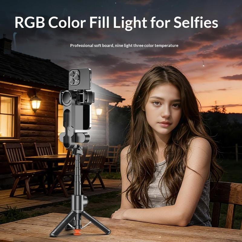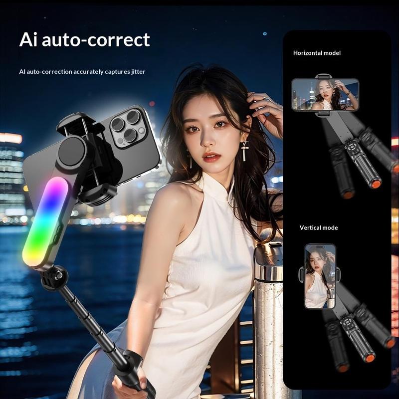 Maak stabielere en flexibelere telefoonvideo’s met de Q34 AI-gimbalstabilisator met beeldstabilisatie voor selfiesticks. Dit compacte accessoire is ontworpen voor livestreaming, selfies, video-opnames, videogesprekken en het maken van alledaagse content, en combineert een stabilisator met één as, een uitschuifbare selfiestick, een statiefvoet, RGB-invullicht en een draadloze afstandsbediening in één draagbaar ontwerp. Met een uitschuifbaar bereik van 16,8 cm tot 71 cm geeft het je meer vrijheid om de kadrering en opnameafstand aan te passen aan verschillende scènes.