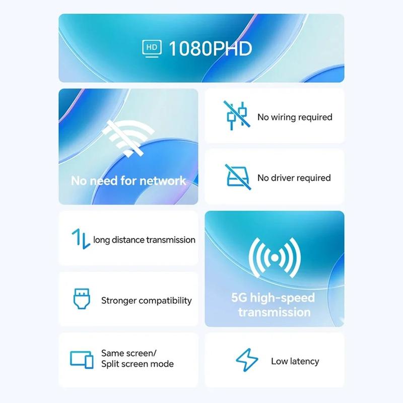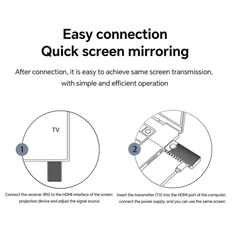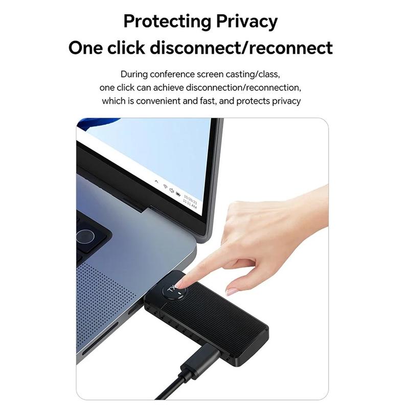Snijd de HDMI-kabel door en deel je scherm in een paar seconden. De Q50 adapter met verticale streep straalt Full-HD video en stereogeluid rechtstreeks van een laptop naar een projector of tv tot op 50 m afstand, via een snelle dual-band 5GHz / 2,4 GHz verbinding. Geen software, geen stuurprogramma's, geen Wi-Fi-netwerk nodig: sluit de Type-C zender aan op je pc, de ontvanger op de HDMI-poort van het scherm en presenteren maar. Automatische moduledetectie, een soepele verversingssnelheid van 60 Hz en ingebouwde beeldbalancering houden dia's, spreadsheets en video's kristalhelder voor elke stoel in de zaal.