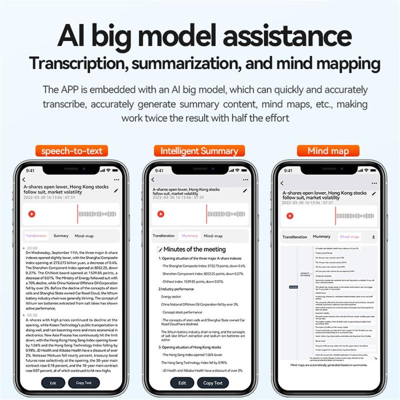 - AI-gestuurde transcriptie: Maak verbinding met de AIREC-APP via Bluetooth om spraak te transcriberen en vertalen in 188 talen, aangedreven door ChatGPT.
