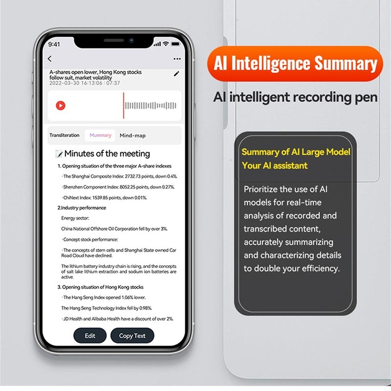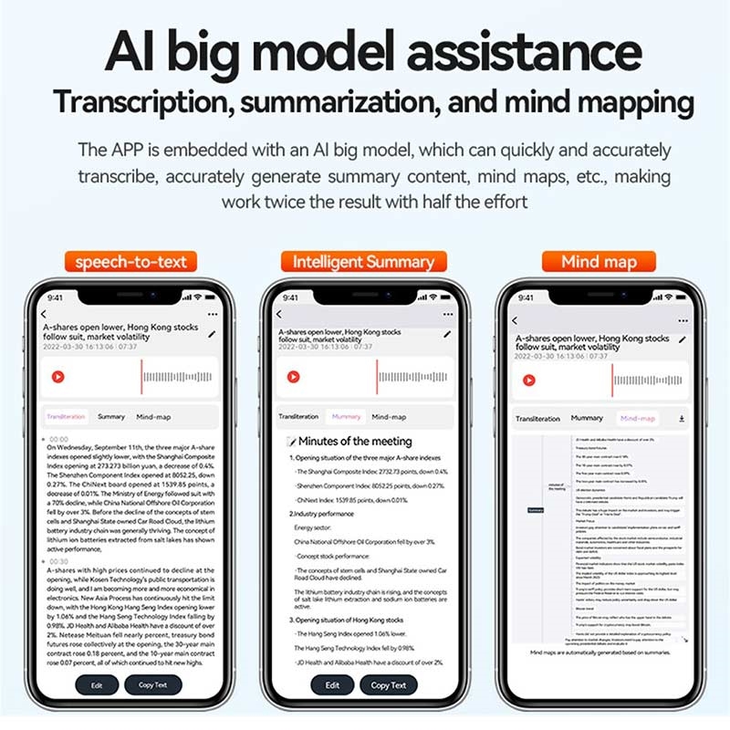 Hoogwaardige audio: Neemt op in WAV-formaat om helderheid en details te behouden in elk gesprek, elke lezing of vergadering. AI-gestuurde transcriptie: Maak via Bluetooth verbinding met de AIREC-APP voor realtime transcriptie en vertaling in 188 talen met ChatGPT-integratie.